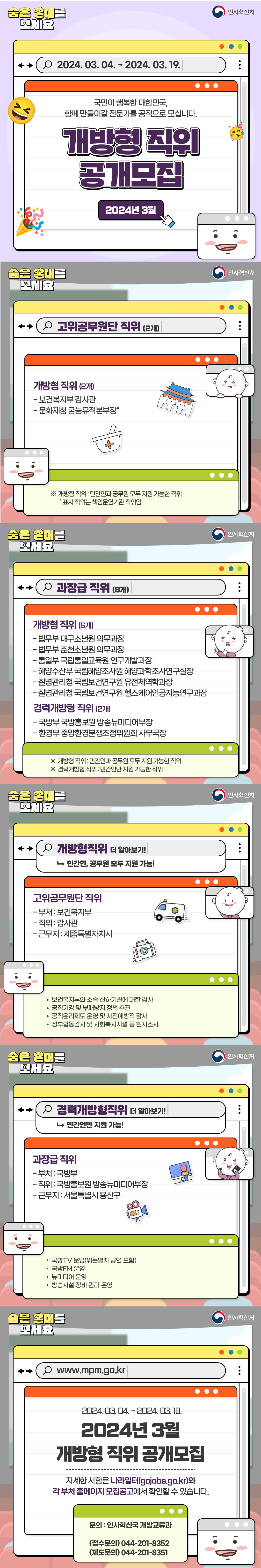 인사혁신처(중앙선발시험위원회)는 보건복지부, 문화재청, 국방부, 법무부 등의 10개 직위에 대해 다음과 같이 공개모집 하오니 역량 있는 분들의 많은 응모를 바랍니다.