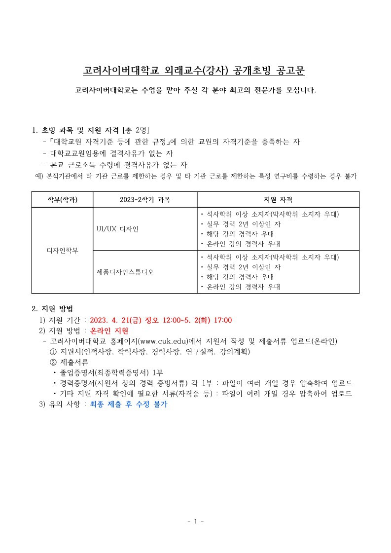 (붙임1)_고려사이버대학교_2023학년도_2학기__외래교수(강사)_공개초빙_공고문(디자인학부).pdf