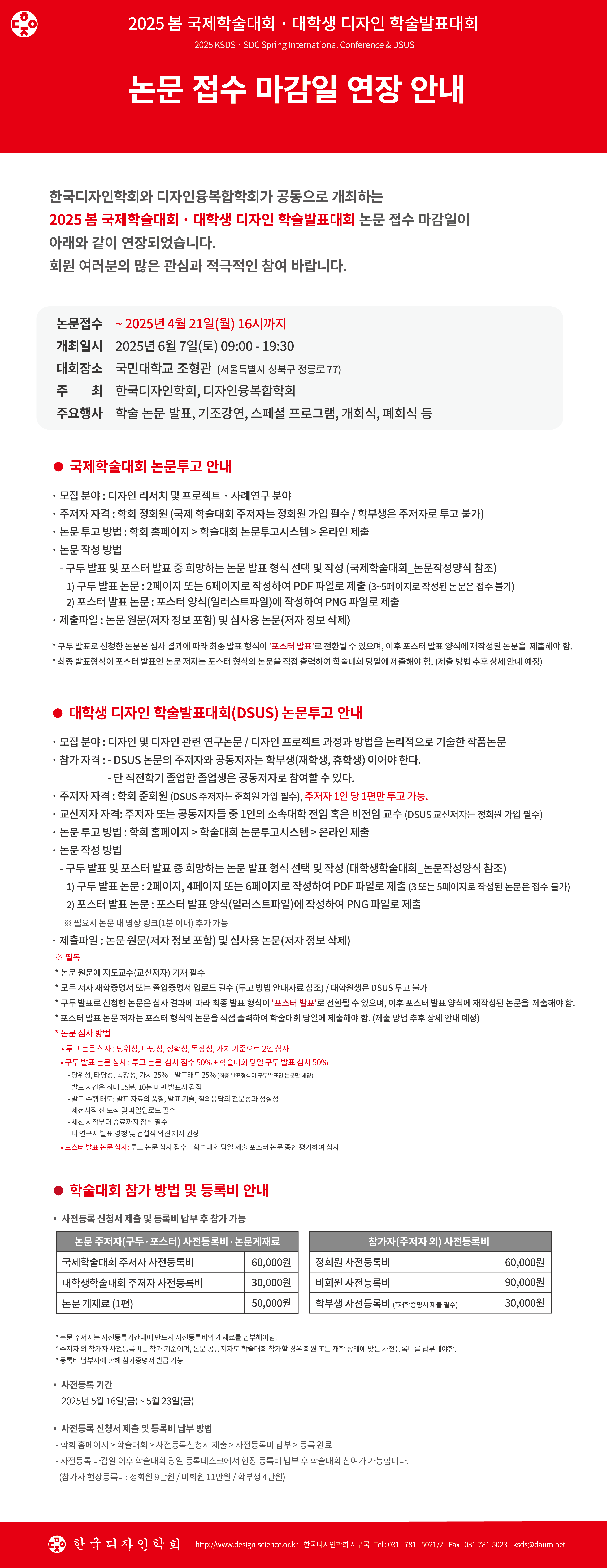 2025 한국디자인학회 봄 국제학술대회 · 대학생 디자인 학술발표대회 논문 접수 마감일 연장 안내(~4/21)